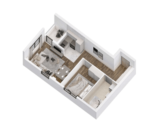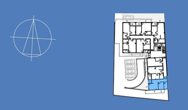 Dvosoban stan na prizemlju. Stan se sastoji od ulaza, kuhinje, kupatila, dnevne sobe, lođe i spavaće sobe.