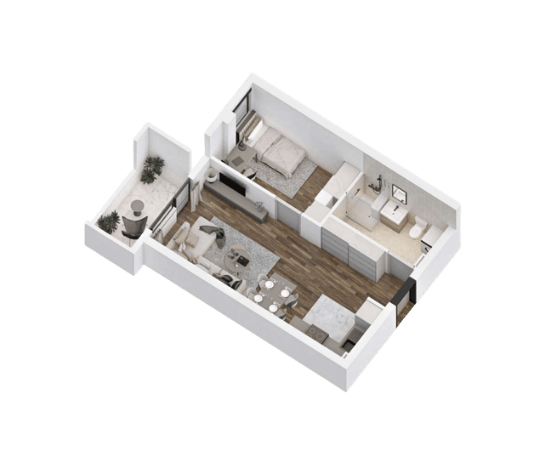 Dvosoban stan na drugom spratu. Stan se sastoji od ulaza, kuhinje, kupatila, dnevne sobe, lođe i spavaće sobe.